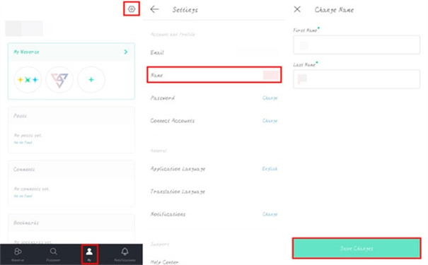 点击下方功能栏的【My】—— 点击右上角的【设置】图标 —— 选择【name】选项,在“姓”与“名”对应的输入框内填写你想要更改的账户名称 —— 最后点击【save Change】按钮完成修改保存。