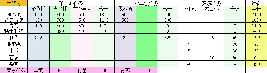 此地有三位村民,分别是宁管事、声望商与杂货商,他们各自负责不同事务。此外,这里还有一项捐赠任务。主要捐赠物资包含青瓦、竹筐以及丝绸。若玩家有意体验,便可前来操作,届时这些物资将直接从仓库中扣除。