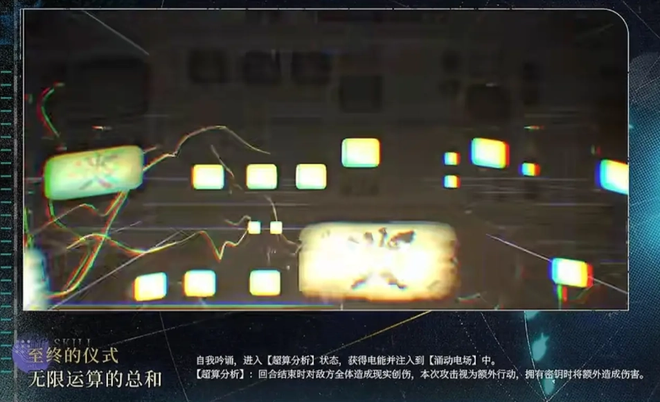 最终的仪式,乃是无线运算的总和。当此仪式达成,乌尔西斯便能进入“超算模式”。在这一模式下,它能够对敌方全体目标造成现实层面的创伤,而且,在一个回合之中,它还可打出两段伤害。