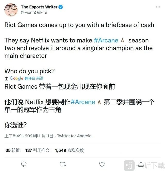 而拳头最新爆料称,《双城之战》第二季将以单个英雄角色作为绝对主角,并就此询问网友意见,想了解大家希望看到哪个英雄成为主角。不知这条推特,是有意让观众投票选角色,还是说拳头早已确定了下一部的主角。
