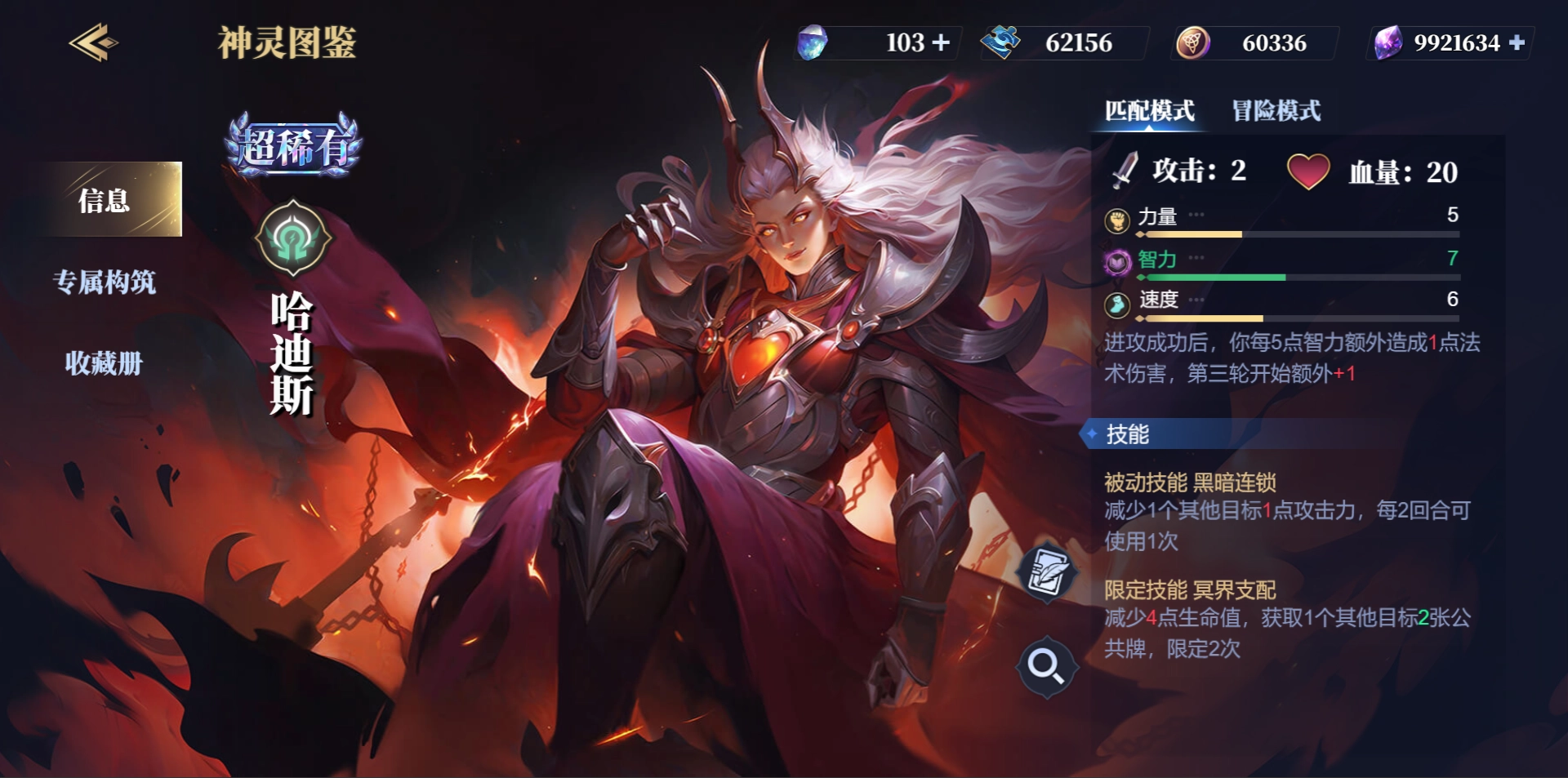 哈迪斯,初始攻击力2点,20血量,力智速初始三维为5/7/6