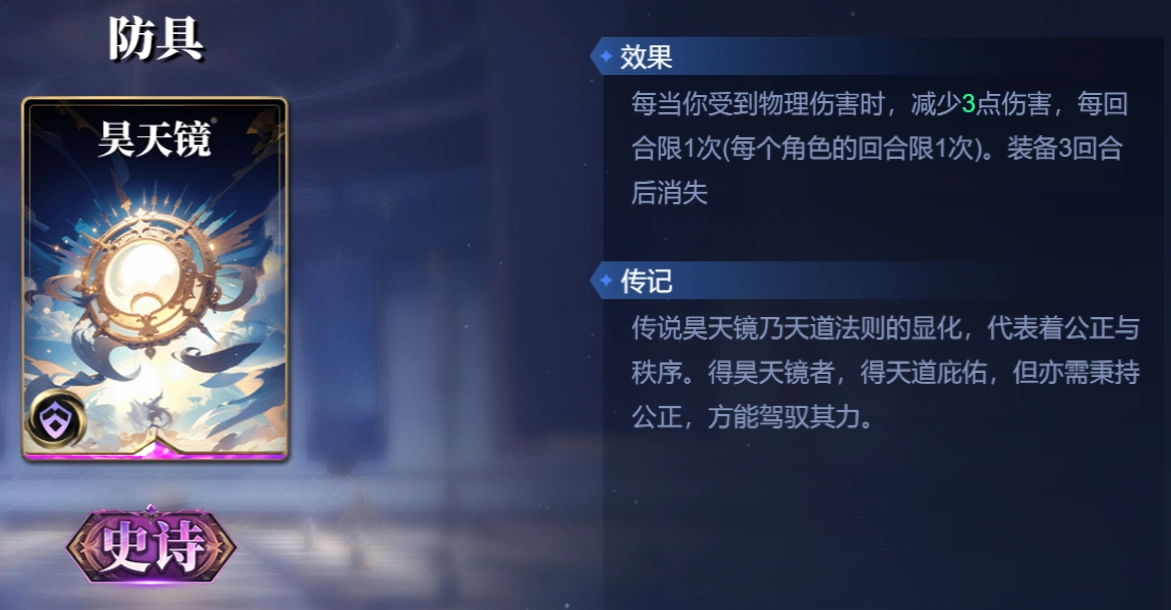 防具选择昊天镜,每当受到物理伤害时,减少3点伤害,每回合限一次,装备3回合后消失。