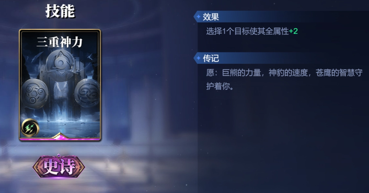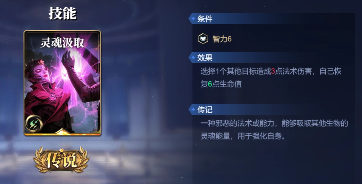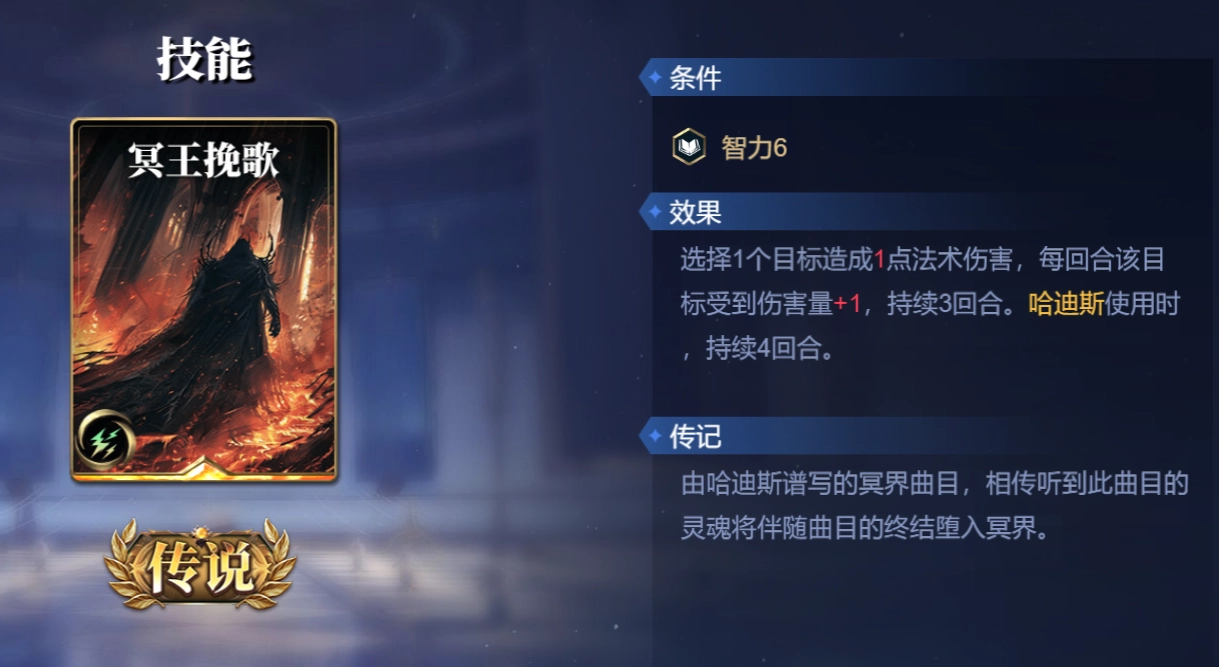 启用条件为智力属性大于等于6 ,其效果为挑选1个目标,对其造成1点法术伤害,且从该回合起,此目标每回合受到的伤害量递增1点,此效果持续3回合。若哈迪斯使用,则持续4回合。