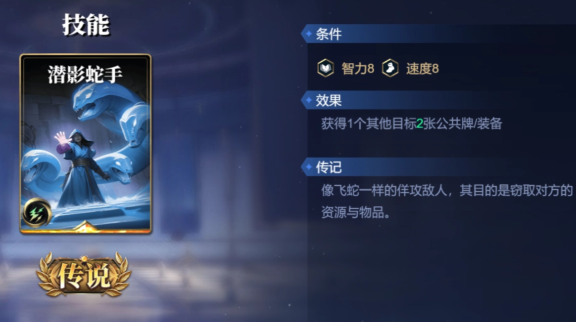 哈迪斯凭借自身基础属性与三重神力相结合,恰好满足潜影蛇手的使用条件。通过运用潜影蛇手,能进一步扩大双方手牌的差距。灵魂汲取这一技能,可用于恢复哈迪斯的血量,而索引咒则能够压缩构筑卡组,迅速检索出其他构筑卡。