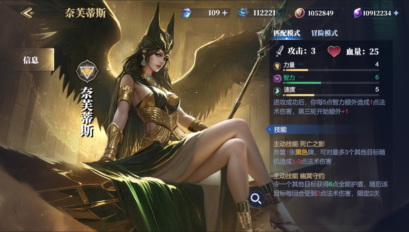 奈芙蒂斯,初始攻击力3点,25血量,力智速初始三维为4/6/5