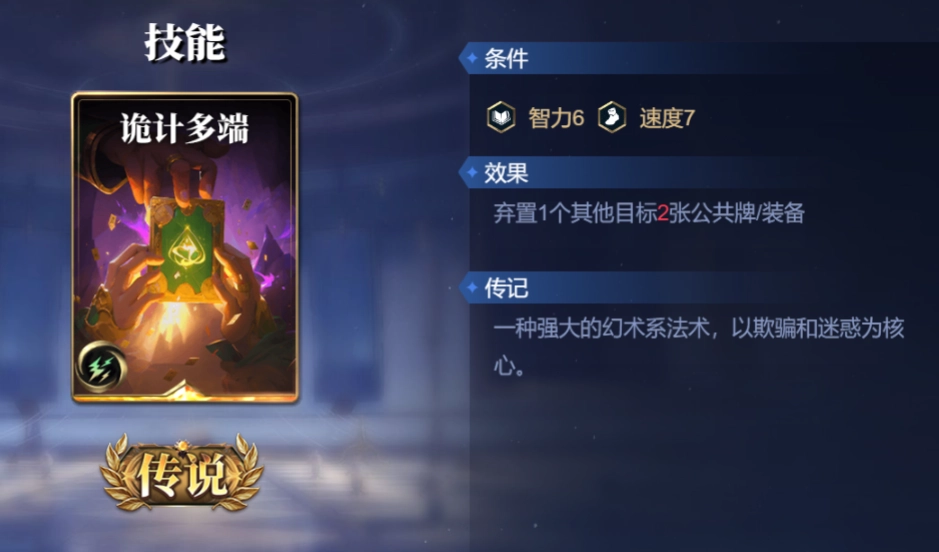 借助三重神力与奈芙蒂斯的基础属性值,能轻易满足“诡计多端”的使用条件。利用“诡计多端”弃掉对手的公共牌或装备牌,进一步拓展自身优势。