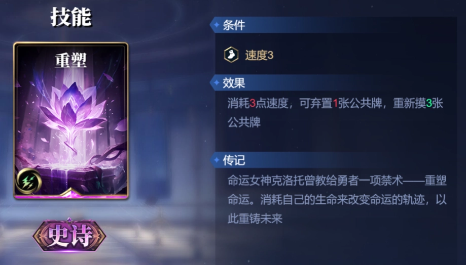 重塑,消耗3点速度,可弃置1张公共牌,重新摸3张公共牌