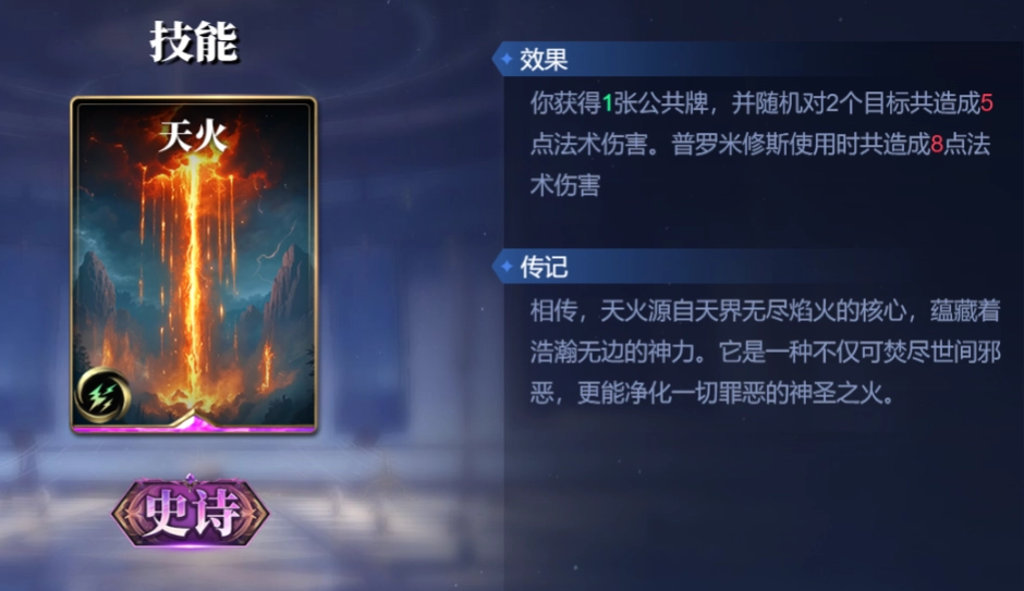 天火,当你使用它后,会获取1张公共牌,同时随机向2个目标总计造成5点法术伤害。而当普罗米修斯使用天火时,总共会造成8点法术伤害。