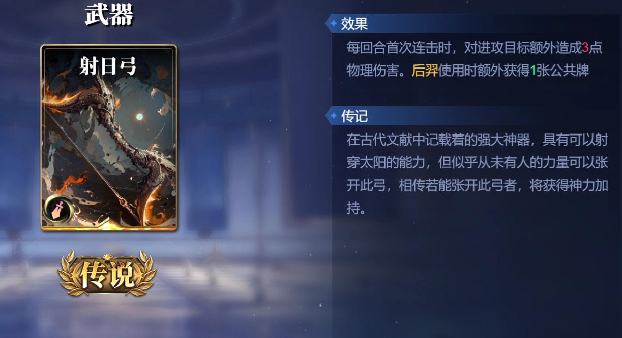射日弓具备独特效果,每回合首次触发连击,会对进攻目标额外造成3点物理伤害。倘若使用者是后羿,还能额外获取1张公共牌。这把射日弓在连击过程中,能带来相当可观的物理伤害输出。当低段数的连击与射日弓相配合,玩家仅需消耗少量手牌,就能有效削减对方的血量。在成功进攻后,只需打出一张手牌,就能造成1点连击伤害,再加上射日弓的3点额外伤害。尤其对于后羿而言,额外获得1张公共牌更是锦上添花。总体而言,射日弓是一张极为强力的卡牌。而后羿的【绝日归尘】技能,对力量属性与速度属性需求较大,基于此,我们选择携带了以下几张卡。