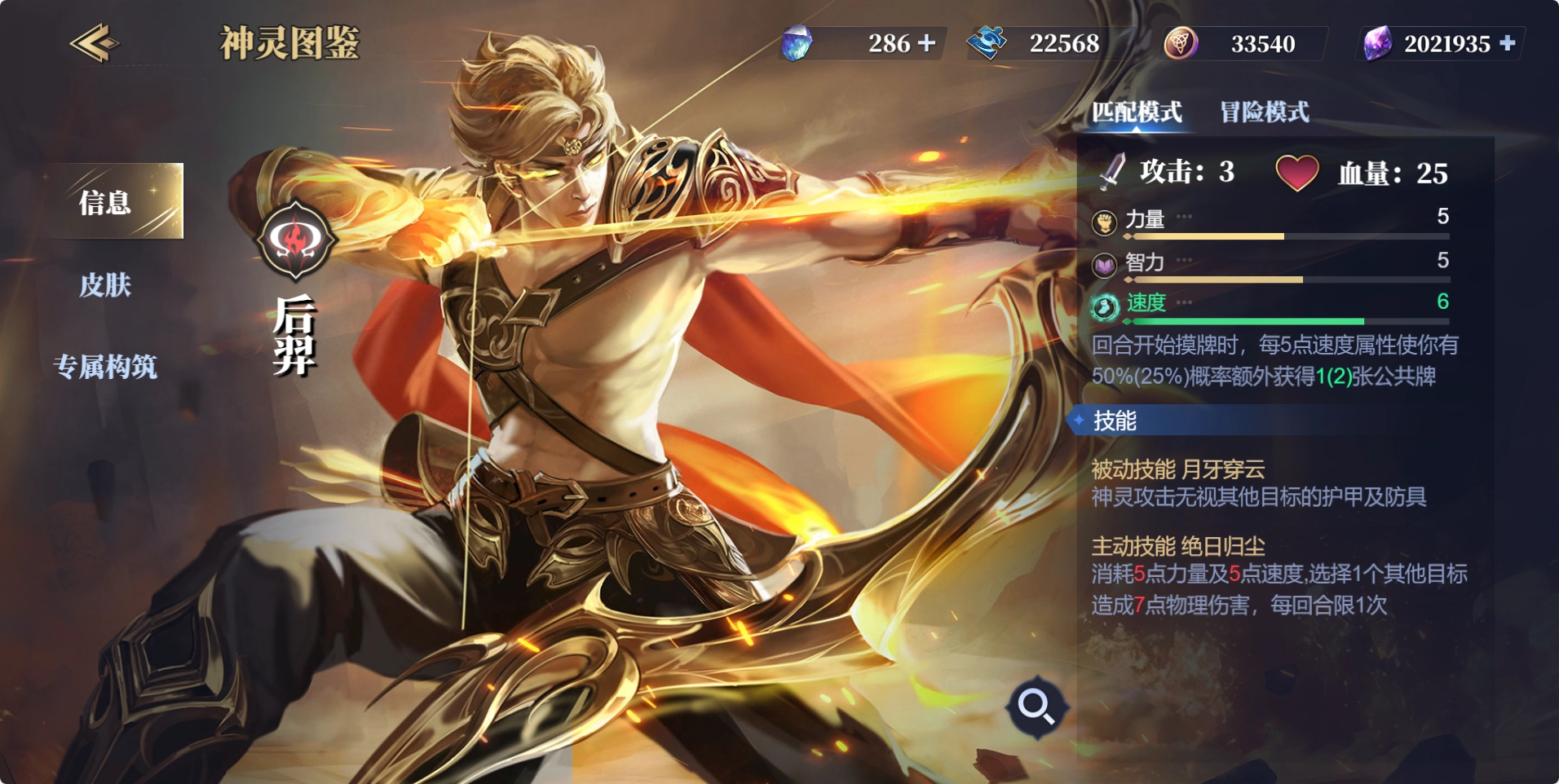 后羿,初始攻击力3点,25血量,力智速初始三维为5/5/6