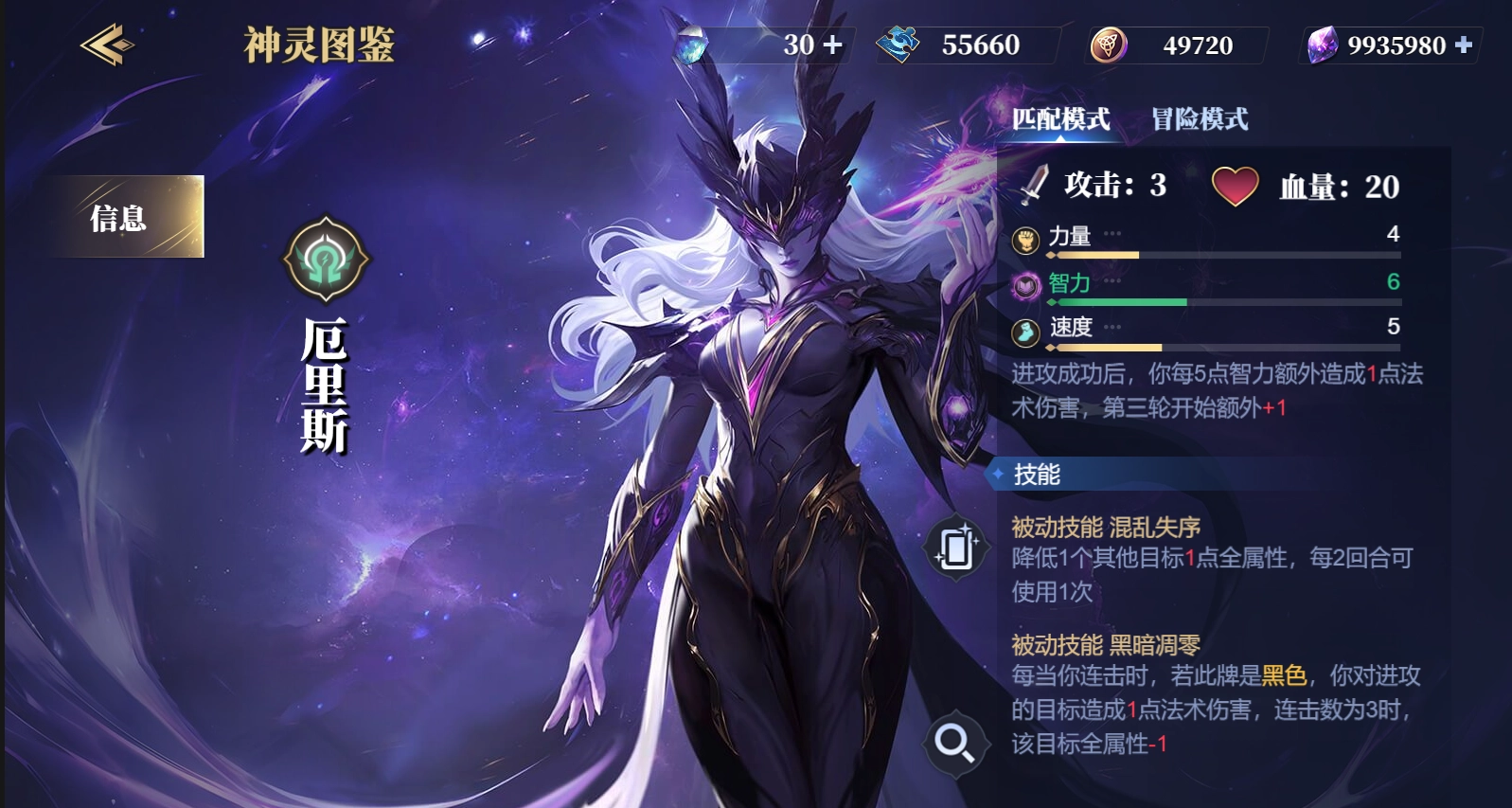 厄里斯,初始攻击力3点,20血量,力智速初始三维为4/5/6。