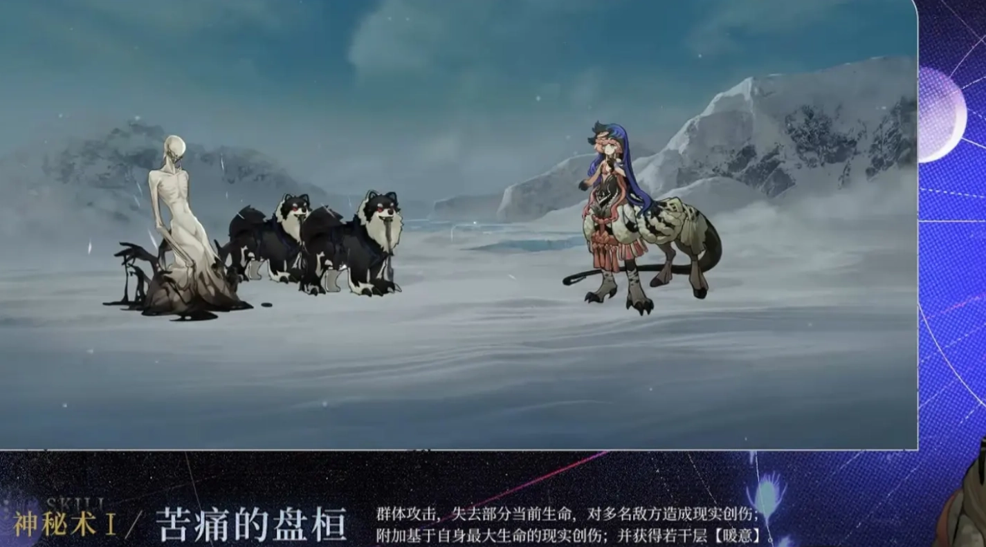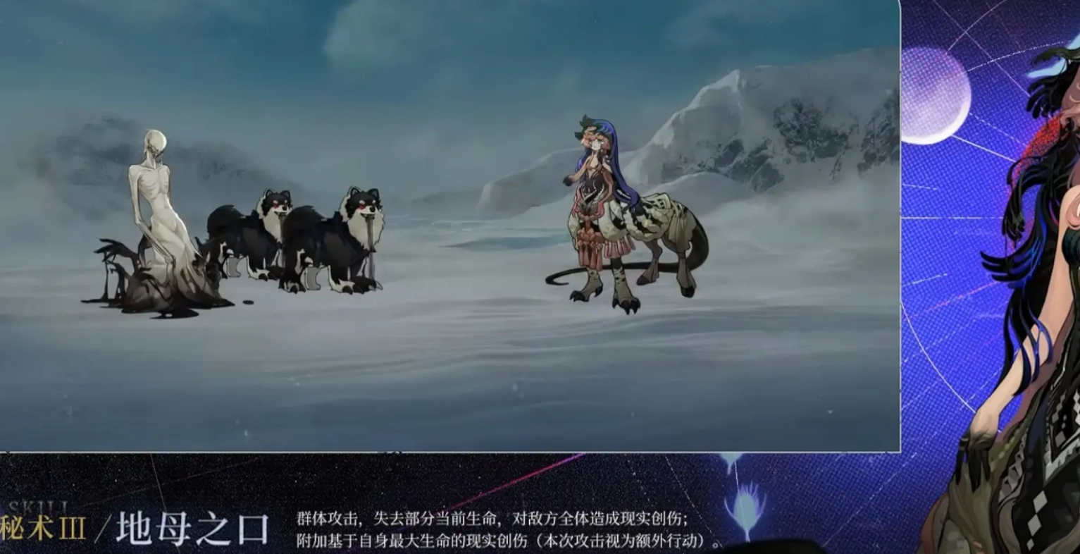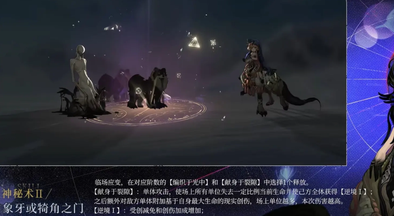 神秘术“象牙或犄角之门”,在不同阶段能够选择不同的释放效果。举例来说,玩家若使用分支技能“现身于缝隙”,便能让场上所有己方单位损失一定生命数值,同时为己方增添一层逆境效果。此逆境效果可额外对敌方附加基于自身血量数值的现实伤害。