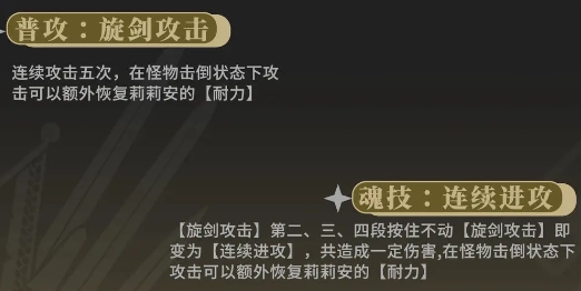 当使用【旋剑攻击】时,在第二、三、四段操作中,若保持按住状态,【旋剑攻击】会转变为【连续进攻】,此招式总共能造成一定程度的伤害。值得注意的是,若在怪物处于击倒状态时发动攻击,莉莉安可额外恢复自身的【耐力】 。