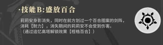 莉莉安的身影瞬间隐去,同一时刻,前方凭空出现一个由剑阵勾勒而成的百合图案,此过程消耗【耐力】。在身影消失的这段时间里,莉莉安不会遭受任何伤害。