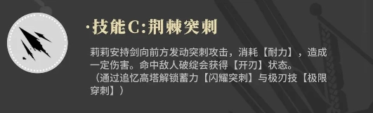 莉莉安手持长剑,朝着前方迅猛发动突刺攻势,此过程会消耗【耐力】,并对目标造成一定程度的伤害。倘若成功命中敌人的破绽,莉莉安将获得【开刃】状态。