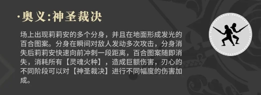 战场上,莉莉安的多个分身同时出现,与此同时,地面浮现出发光的百合图案。这些分身会在刹那间向敌人发动一连串攻击。待分身消散后,莉莉安会迅速朝着前方冲刺一小段距离,而此时,百合图案也会跟着消失不见。此过程中,所有【灵魂火种】将被消耗殆尽,从而造成巨额伤害。值得注意的是,刃心处于不同阶段时,能够对【神圣裁决】带来不同程度的伤害加成。