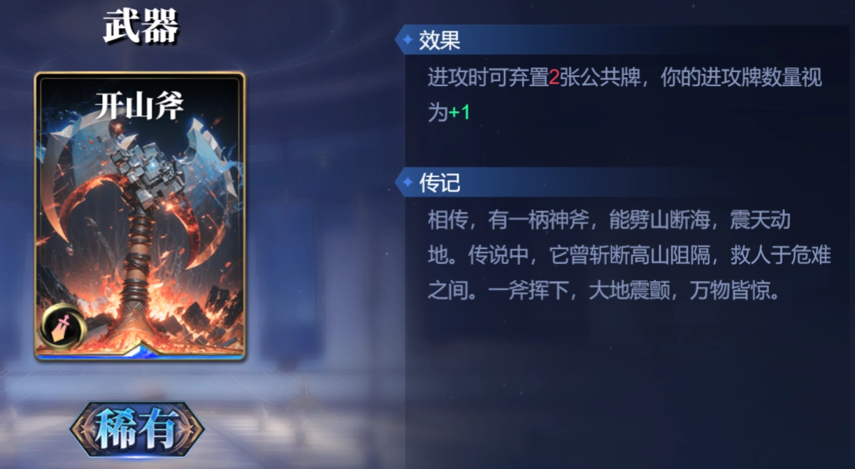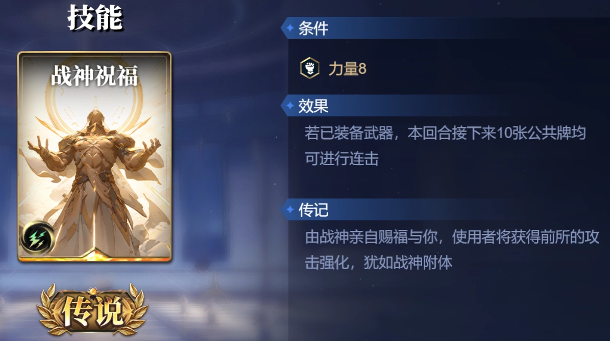 战神祝福,若已装备武器,本回合接下来10张公共牌均可进行连击
