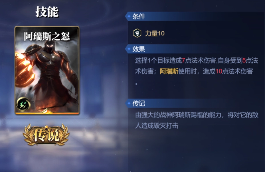 阿瑞斯之怒的使用条件为力量属性大于等于10点。其效果为:可挑选一个目标,对其造成7点法术伤害(若由阿瑞斯使用,则造成10点法术伤害),同时自身会受到5点法术伤害。