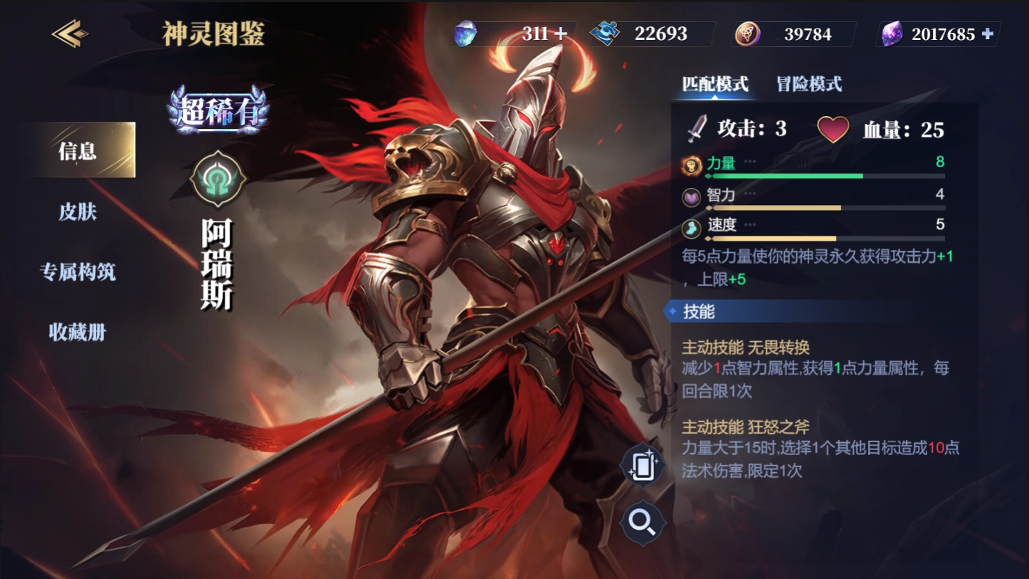 阿瑞斯,初始攻击力3点,25血量,力智速初始三维为8/4/5