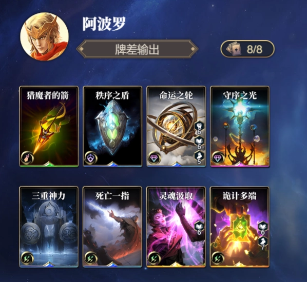 猎魔者的箭,是阿波罗主要的输出手段,再拉大牌差后,利用其效果对对手额外造成手牌差值的法术伤害。