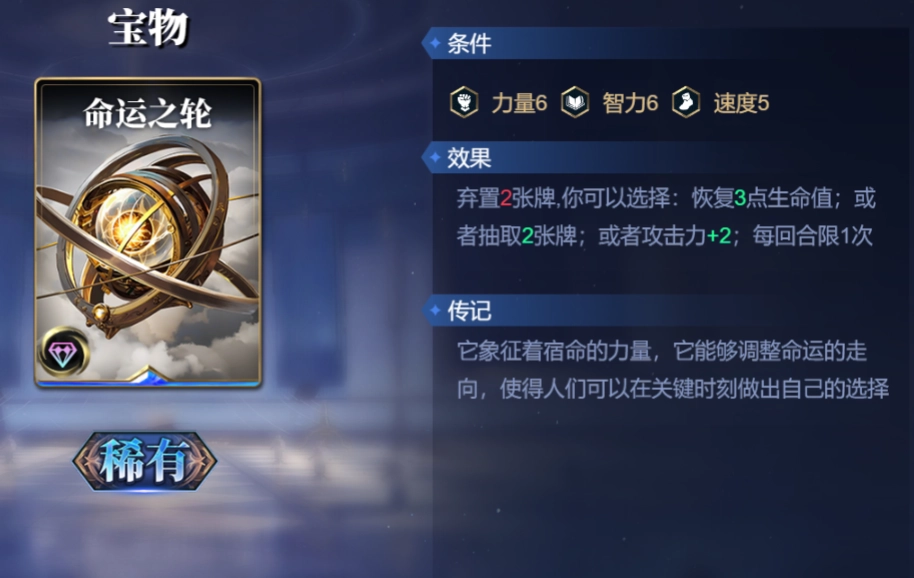 命运之轮,这是一张具备多功能特性的牌。你能够灵活挑选回血、加攻或者摸牌等效果,以此来应对各式各样的状况。当你的手牌数量远远多于对手时,它所具备的战略意义便极为重大。尽管这张牌存在三维方面的使用限制,不过借助携带三重神力就能够予以解决。