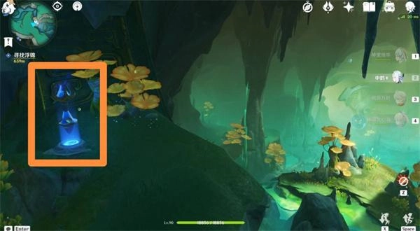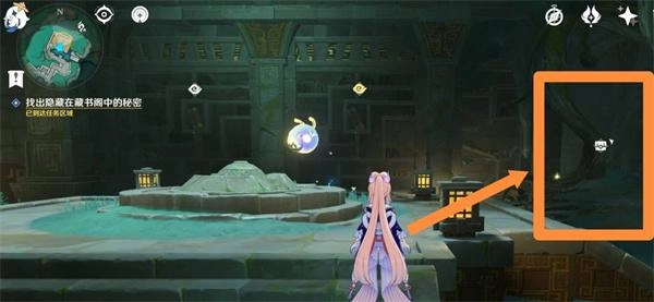 往最深处走,到如图所示的地方,消灭蜘蛛网上的蜘蛛,接着抵达宝箱所在之处,阅读旁边的书籍,直至读完。(完成“将对应元素的书,放入对应的元素框中”这一谜题,借助元素视野操作,若发现少一本元素书,别忘了回头查看。)