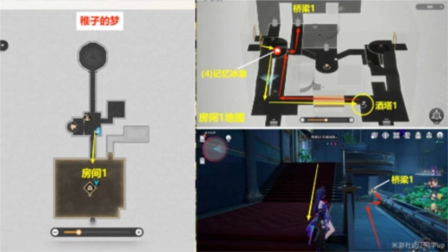 1(1)进入下方【房间1】,右前方能看到【记忆冰泉】贴纸。接着从【酒塔1】处获取【梦泡充能次数】,之后从【桥梁1】处上去。