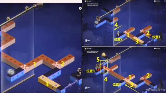(2)点击并旋转1个橙色模块1次,把3个黄色模块移至左上方,将4个镜子朝左下方移动,让5号位置拼接在一起,这样【钟表小子】就会从位置2移动到位置3。