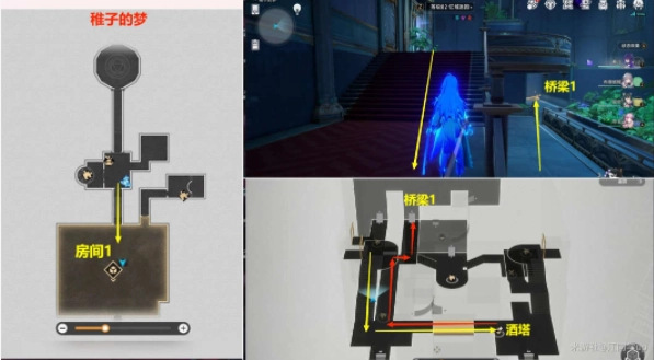 (1)进入【房间1】后,先去【酒塔】获取次数,接着从【桥梁1】上去;