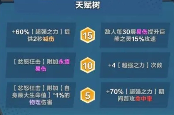 需留意的是,当下该永续易伤无法获得其他流派的加成。每次仅能叠加4层。对于选择普攻流的巨熊之灵玩家而言,这一天赋具备一定价值,可考虑选用。而右侧天赋能够增加大招的攻击次数,点选此天赋后,大招的攻击次数从原本的4次显著提升至8次,且大招期间的攻击不仅有攻速与攻击力加成,还具备不消耗易伤层数的优点。对于期望走大招流的玩家来说,右侧天赋是个值得考量的选项。