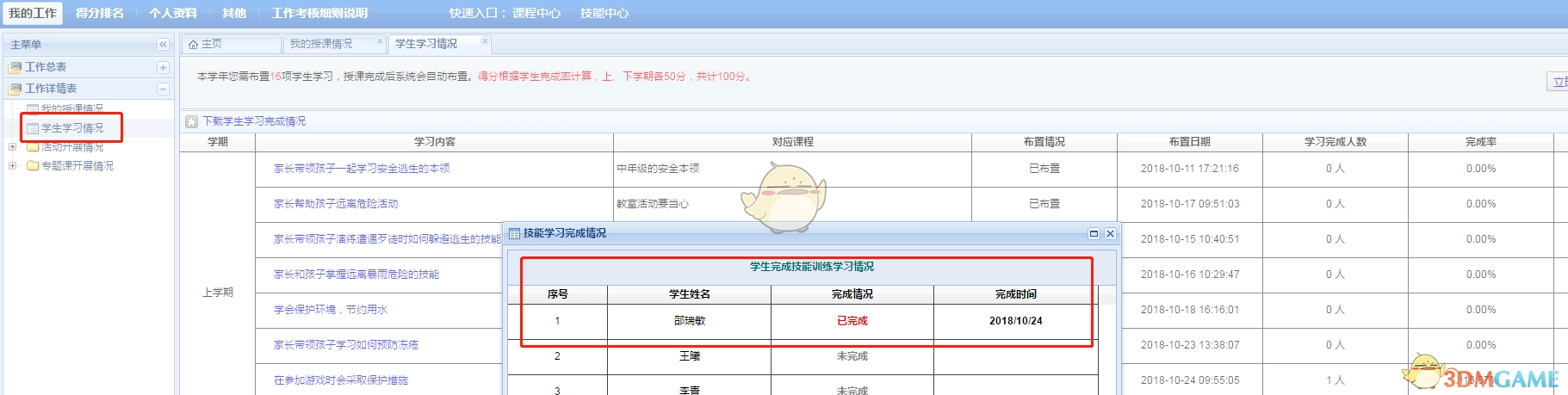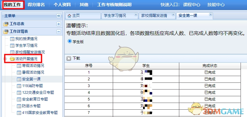 教师要凭借在学校注册的安全平台账号登录平台,进入管理系统之后,按顺序点击“我的工作”、“工作详情表”,接着从“学生学习情况”与“专项活动情况(专题课开展情况)”中进行选择,如此就能查看本班学生的详细完成状况,其中涵盖已完成作业、待完成作业列表,还有具体的学习进度以及成绩。