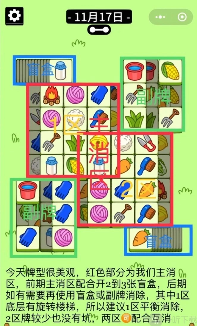红色区域说明:左上角区域与右下角区域是红色重叠区域,在消除过程中,应优先考虑借助周边的牌来辅助完成消除。要是周边牌无法实现消除,那么就借助盲牌来处理。