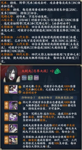 Tip:该被动能降低查克拉消耗,缓解小队查克拉紧缺的情况,同时进一步提升大蛇丸奥义的衔接程度。