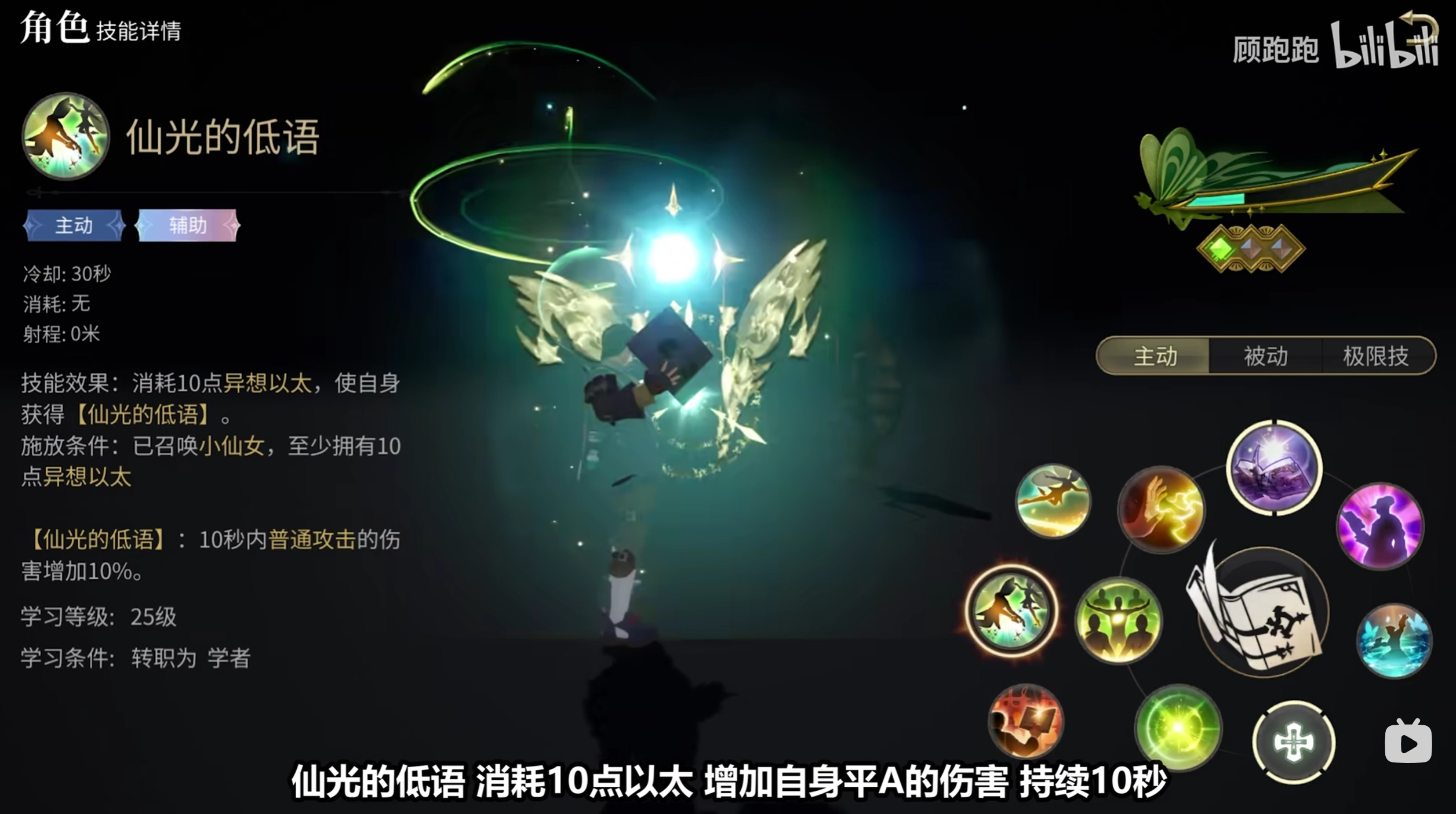 【仙光的低语】需消耗10点以太,可提升自身普通攻击(平A)的伤害,效果持续10秒。该技能在端游中属于群体回血技能,而在手游里被修改为给自己添加增伤buff。