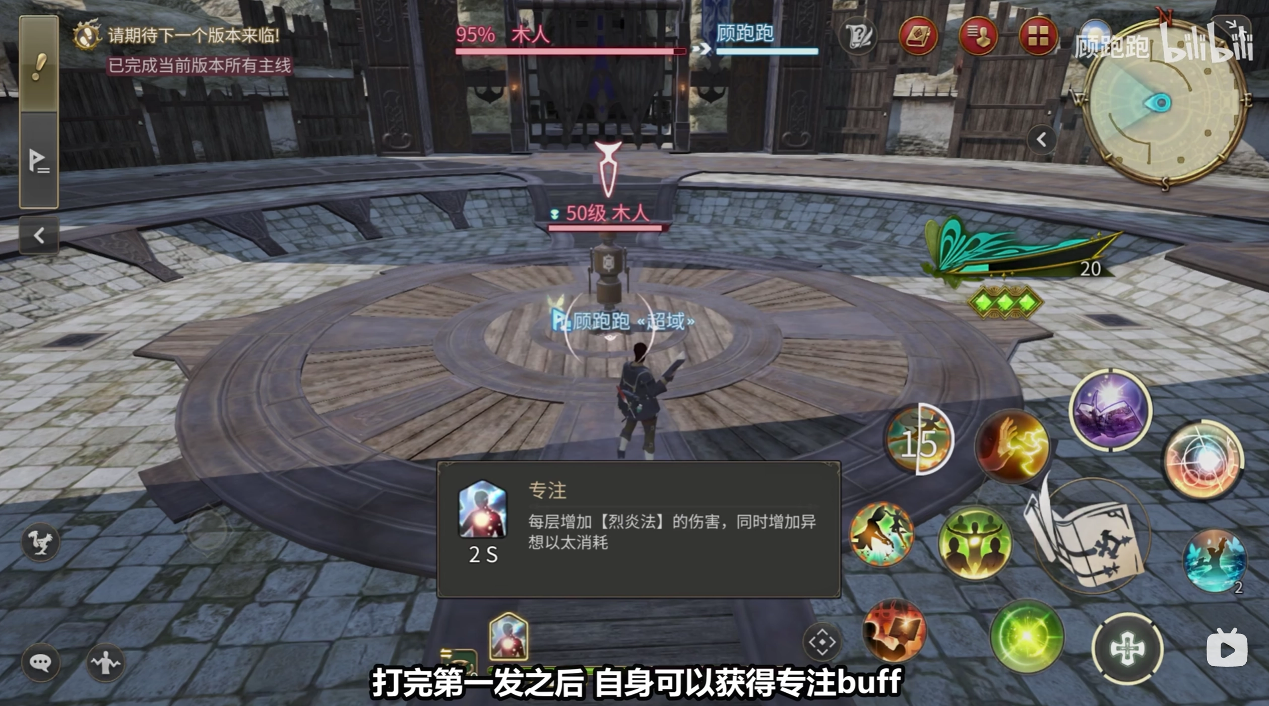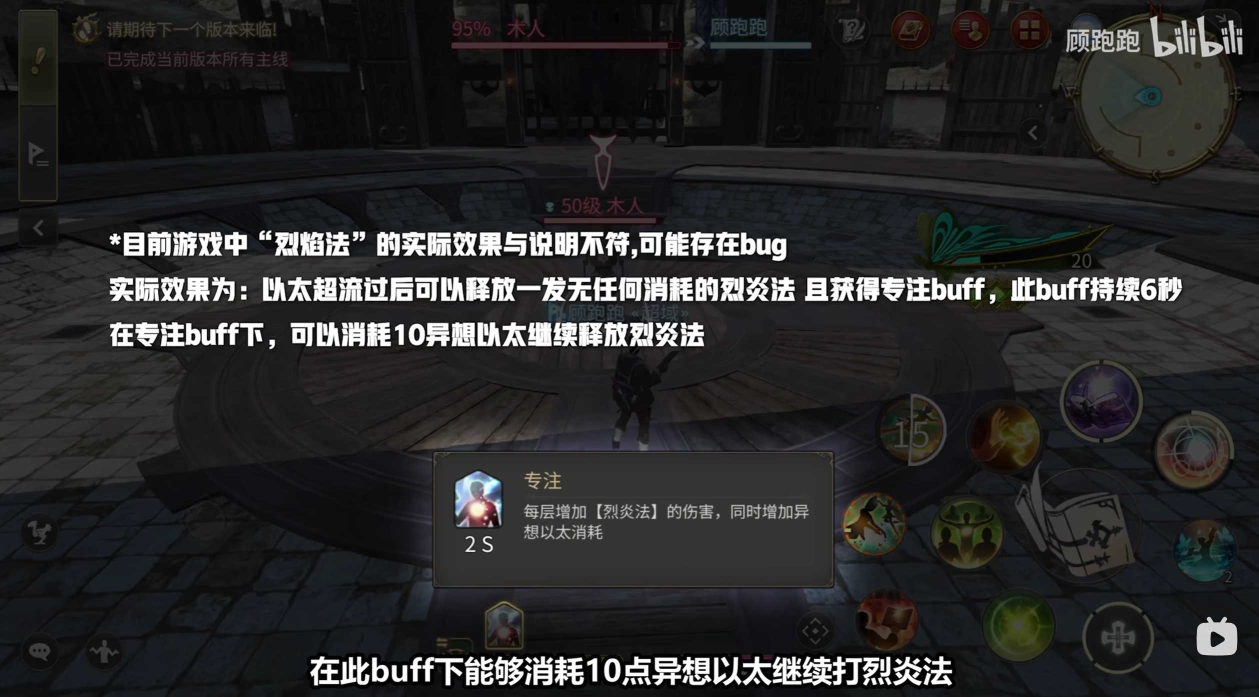 【烈炎法】属于群体AOE技能,释放第一发后,角色自身会获取“专注”buff。处于该buff状态时,可消耗10点“异想以太”,进而再次施展【烈炎法】。