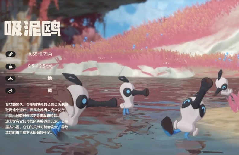在游戏的宣传画面中,玩家能够瞧见吸泥鸥现身于水边,特别是某些泥潭附近,同时会有几个精灵角色聚在一块儿齐声歌唱。它们之所以出现在此地,关键在于精灵若想实现成长,就离不开一定的微量元素,而这些泥土恰好含有精灵所需的此类元素。精灵的四周始终萦绕着大量音符,这一设定与游戏里的绿耳松鼠极为相像,玩家在游戏后期不妨尝试让这两个角色组队。