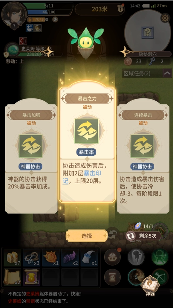 当然,协击仅仅是这东西的基础功能。在游戏进程里,你会碰到“神器强化石”,拾取之后,神器可获取各类强化效果,升级效果需从三个之中选择其一。