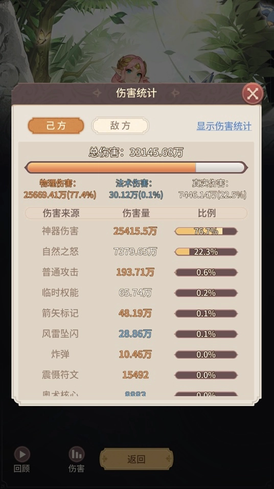当然,咱们今天要讲的“逛该输出流”,是以利用神器高频协击造成高伤害为核心来构建的流派。在这个流派里,全程一门心思培养神器,相比之下,角色天赋等都成了辅助要素。简直可以说神器才是MVP,冒险者只要稍微操作下就能轻松躺赢。(就看下图的伤害占比,谁是主C一目了然)