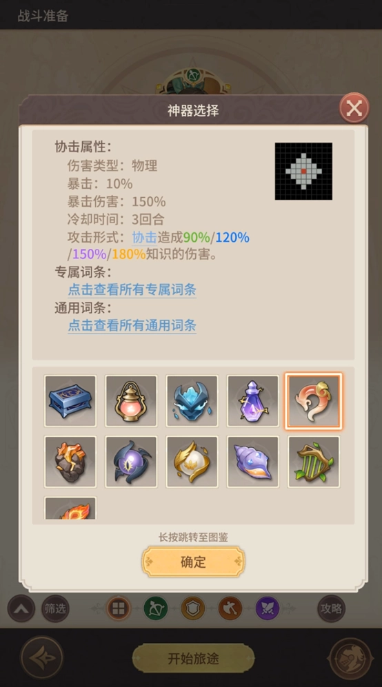 本篇为大家奉上《狭道英雄》神器流派的玩法攻略!游戏开启时,处于准备阶段,玩家能够从众多神器里挑选一个投入使用。在游戏进程中,所选神器会始终跟随玩家行动。经过一定回合数后,神器会发动一次协击,对周围范围内的怪物造成伤害,而神器协击伤害的数值,与角色的“知识”属性紧密相关。