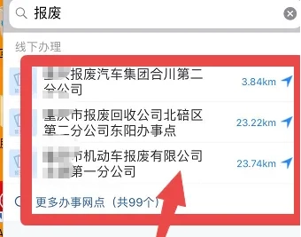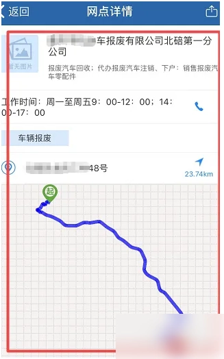 这时,我们便能看到报废车辆处理的地址信息,点击“报废处理公司”。