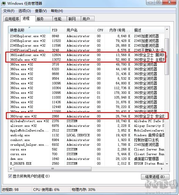 从上述两个任务管理器进程可知,在未进行任何扫描、杀毒、修复等操作时,金山毒霸内存占用约60M,360的内存占用约80M,二者差距不大。实际上,这样的测试并不精确,对于电脑配置不算特别低的电脑而言,实在无需过分在意这点内存占用情况。