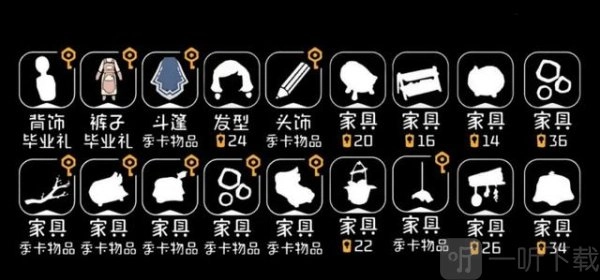 6、除基础物品外,还有大量家具背饰。本季节的向导,经营着一家家具店,其店铺招牌便是一个背饰标志。这些家具背饰无需季卡,部分可用游戏内货币兑换,如普通蜡烛、升华蜡烛、爱心,共需1963根普通蜡烛、555个升华蜡烛、485颗爱心。