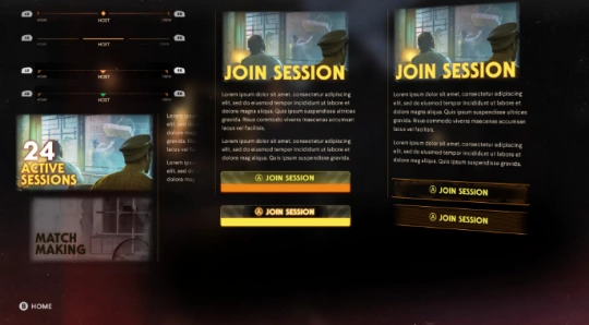这些图片虽以用户界面设计为主要展示内容,不过我们也能从中捕捉到游戏内场景的些许影子。尽管它只是某菜单的模糊背景,但依然能辨认出,这像是一处光线昏暗的安全屋,里面堆着板条箱与盒子。鉴于它出现在招募菜单的后方,这极大可能暗示该地点曾是玩家的主要活动枢纽或核心兴趣点。