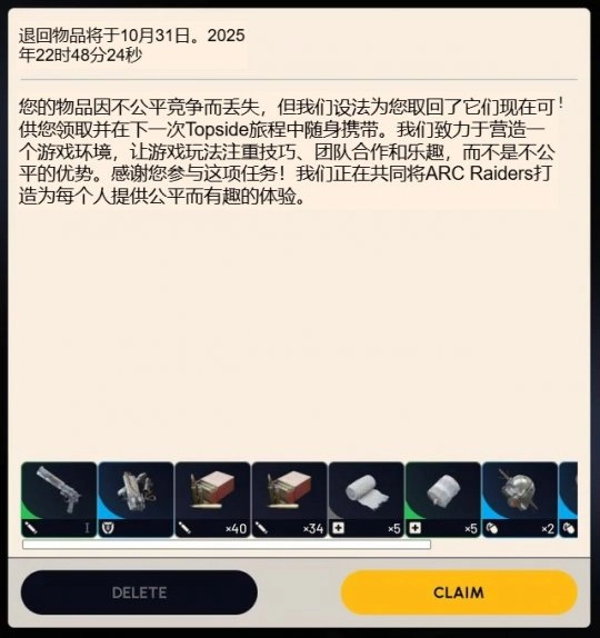 若对局被核实存在作弊情况,玩家死亡时掉落的装备将予以返还。一张游戏内的提示截图显示,系统会针对不公平对局即时退还玩家损失的物资,这一消息在玩家群体中引发了积极的反响。