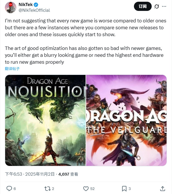 随后@NikTekOfficial进一步补充道:“我并非认为所有新游戏都比不上老游戏,只是在某些情况下,把部分新游戏和老游戏放在一起比较时,相关问题就会迅速暴露出来。另外,新游戏的优化质量也越来越不尽如人意,要么画面呈现模糊,要么就需要配备顶级配置的电脑才能实现流畅运行。”