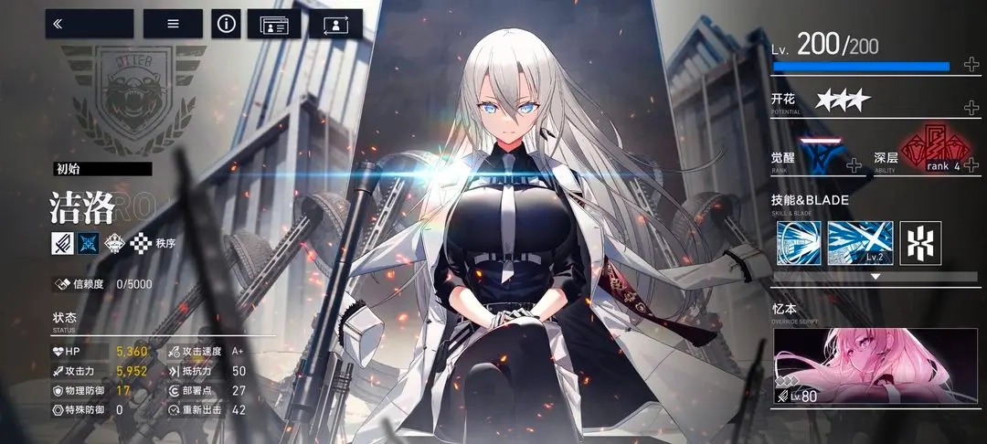 1.初始形态优势 身着白色制服的初始形态洁洛,在装备专属忆本后迎来质的飞跃,输出能力跃升至顶尖梯队。她的综合属性趋近六边形均衡分布,既能担当强力输出又具备可靠生存能力,是下塔挑战中优先培养的不二之选。