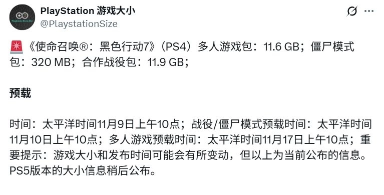 游戏资讯账号PlayStationSize借助设计平台,对外公布了动视Treyarch旗下即将上线的第一人称射击游戏《使命召唤:黑色行动7》的预载时间及下载大小。