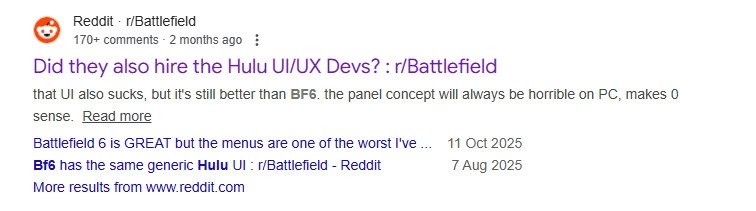 《战地6》的UI界面一直以来都备受玩家批评,被吐槽布局混乱,甚至在BETA测试阶段就有玩家直言其UI设计糟糕,并自己动手制作了主菜单UI。不过这款游戏的UI之所以如此拉胯,并非毫无缘由——实际上,《战地6》的UI竟然直接套用了美国流媒体平台Hulu的设计,也难怪如今会被对方起诉了。