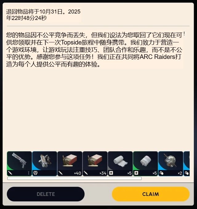 若确认对局中存在作弊行为,玩家在死亡时损失的装备将予以返还。游戏内的一张提示截图显示,系统会针对不公平对局立即返还玩家损失的物资,这一情况的发现得到了玩家群体的积极反馈。