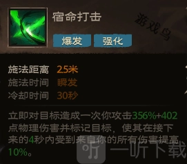 效果:即刻对目标发动一次等同于你攻击力356%加上402点的物理伤害,并标记该目标,让其在后续4秒内承受来自你的全部伤害提升10% 。